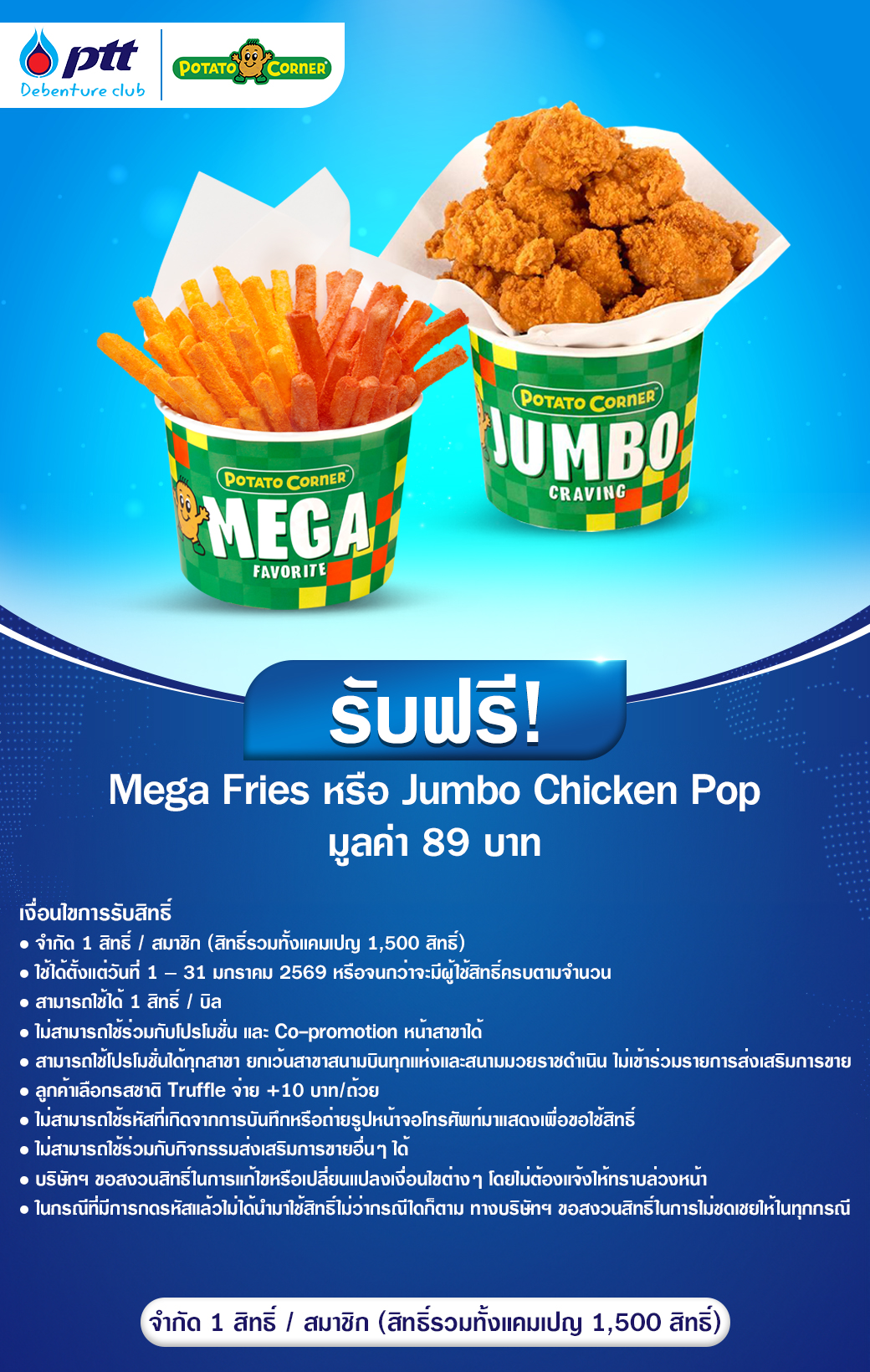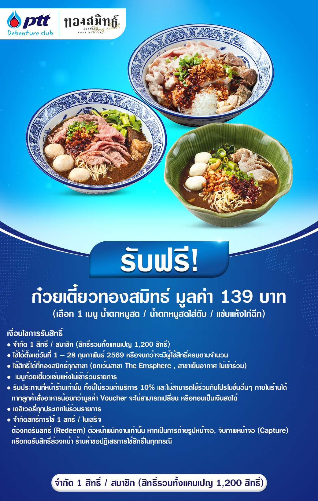 สิทธิพิเศษ หน้าแรก / กิจกรรมเพื่อผู้ถือหุ้นกู้ฯ / สิทธิพิเศษ วันที่เริ่มสิทธิพิเศษ วันที่สิ้นสุดสิทธิพิเศษ สิทธิพิเศษ รายละเอียด เงื่อนไขและรายละเอียด 1 กุมภาพันธ์ 2569 28 กุมภาพันธ์ 2569 หรือจนกว่าจะมีผู้ใช้สิทธิ์ครบตามจำนวน ทองสมิทธ์ รับฟรี ก๋วยเตี๋ยวทองสมิทธ์ มูลค่า 139 บาท (น้ำตกหมูสด, น้ำตกหมูสดใส่ตับ, แซ่บแห้งไก่ฉีก) ดาวน์โหลด 1 มกราคม 2569 31 ม.ค. 2569 หรือจนกว่าสิทธิ์จะครบตามจำนวน Potato Corner รับฟรี Mega Fried/Jumbo Chicken Pop 89 บาท ดาวน์โหลด 22 ธันวาคม 2568 30 มิ.ย. 2569 Magic E-Voucher Central Group รับฟรี ส่วนลดแทนเงินสด มูลค่า 100 บาท พิเศษสำหรับผู้ถือหุ้นกู้รายใหม่ ดาวน์โหลด 1 ธันวาคม 2568 31 ธ.ค. 2568 หรือจนกว่าจะมีผู้ใช้สิทธิ์ครบตามจำนวน Magic E-Voucher Central Group รับฟรี ส่วนลดแทนเงินสด มูลค่า 100 บาท ดาวน์โหลด 1 พฤศจิกายน 2568 30 พ.ย. 2568 หรือจนกว่าจะมีผู้ใช้สิทธิ์ครบตามจำนวน koi the รับฟรี ส่วนลดแทนเงินสด มูลค่า 100 บาท ดาวน์โหลด 1 ตุลาคม 2568 30 ต.ค. 2568 หรือจนกว่าจะมีผู้ใช้สิทธิ์ครบตามจำนวน Watsons รับฟรี e-Coupon มูลค่า 100 บาท ดาวน์โหลด 1 กันยายน 2568 30 ก.ย. 2568 หรือจนกว่าจะมีผู้ใช้สิทธิ์ครบตามจำนวน Lotus's รับฟรี e-Coupon มูลค่า 100 บาท ดาวน์โหลด หมายเหตุ โปรดอ่านเงื่อนไขก่อนกดรับสิทธิ์ อ่านรายละเอียดและชมวิดิโอสาธิตการใช้งาน คลิกที่นี่